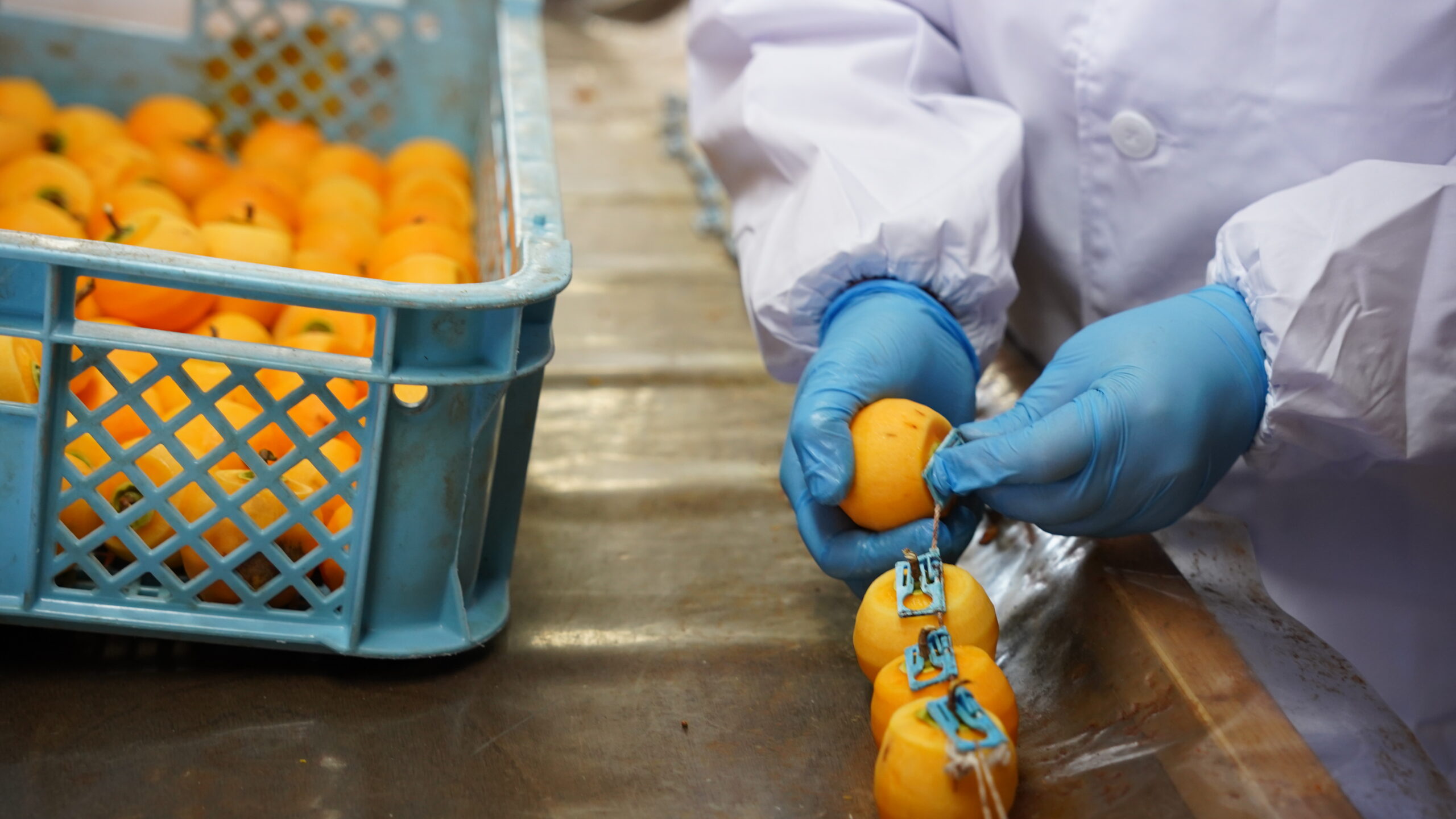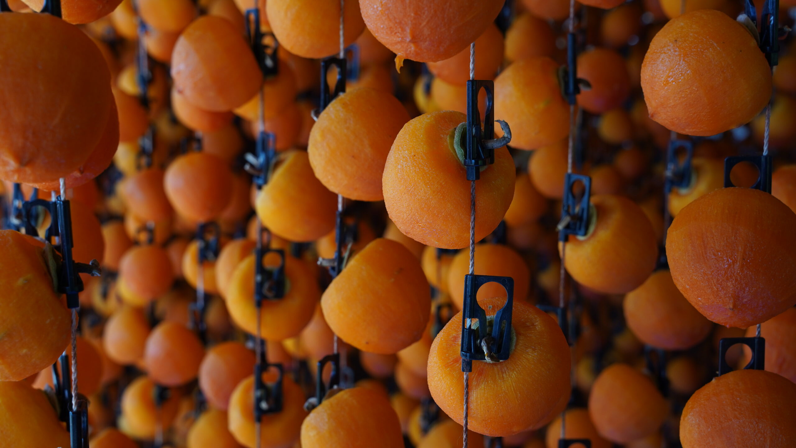 1本の柿のれんには15~20個の生柿を吊るすため、その重量は2㎏前後になります。