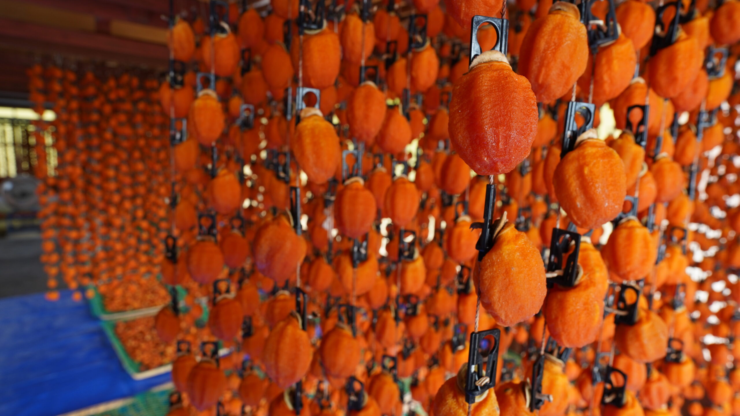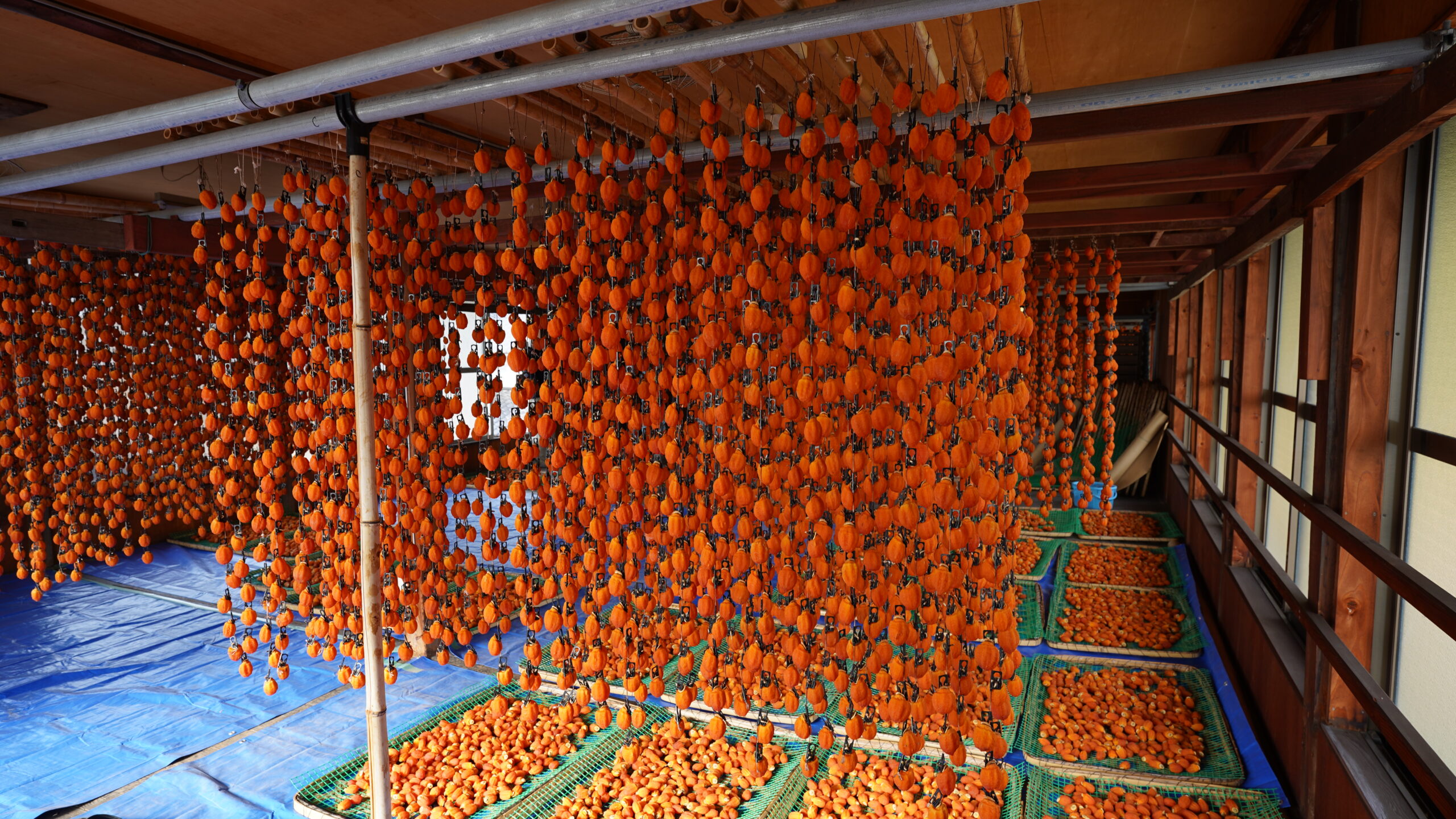 2階建ての専用の柿干し場やビニールハウスに柿のれんを移し、3週間~1カ月ほど乾燥します。